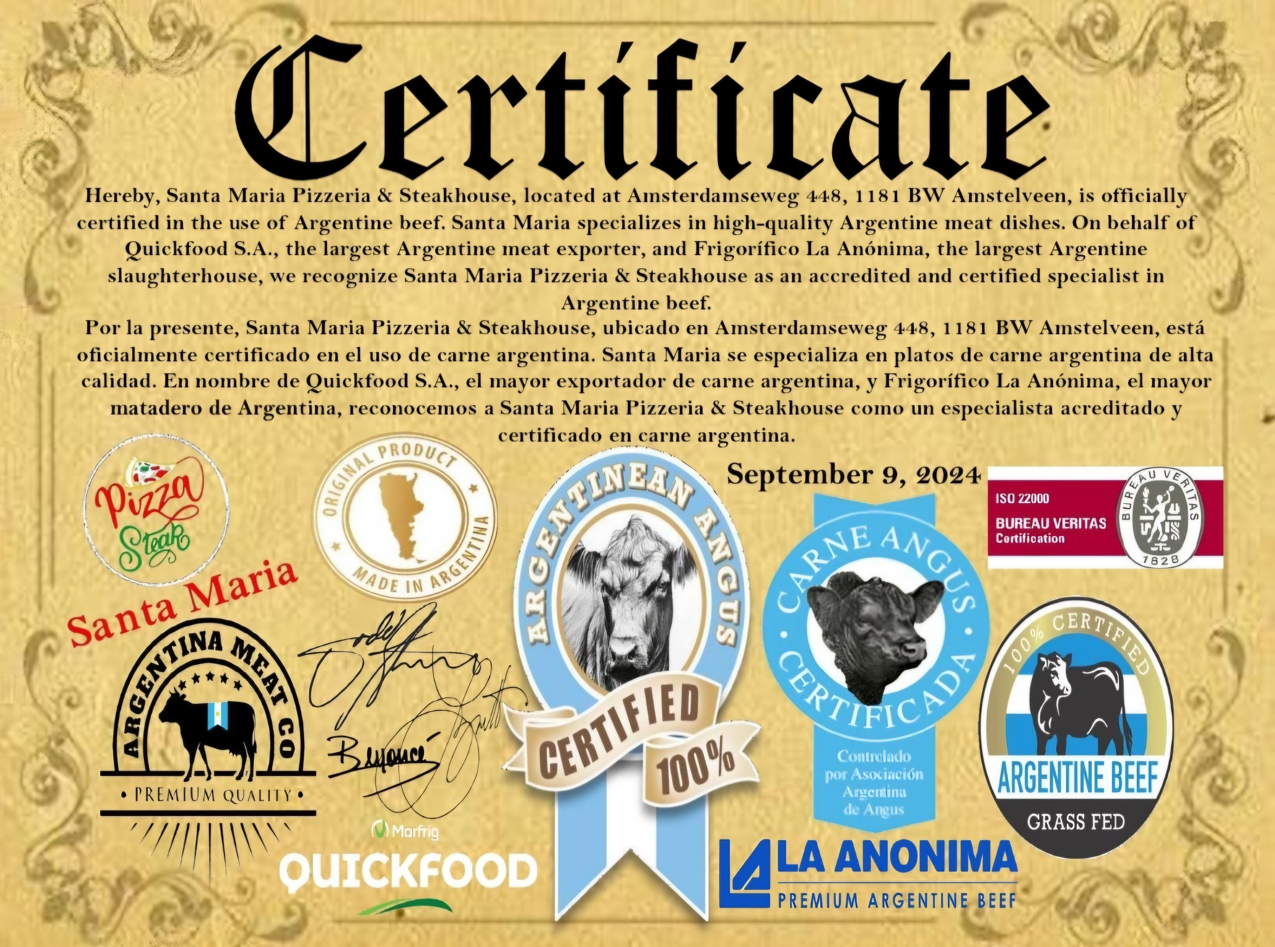 Bij Santa Maria zijn we niet alleen dé plek voor heerlijke pizza’s en pasta’s, maar ook een echte Argentijnse steakhouse. Wat maakt ons anders? Wij zijn gecertificeerd in het werken met Argentijns Angus vlees, en we gaan verder dan de standaard. We halen alleen het allerbeste vlees, en werken uitsluitend met bruine en zwarte Angus, omdat dit vlees simpelweg het beste van het beste is.